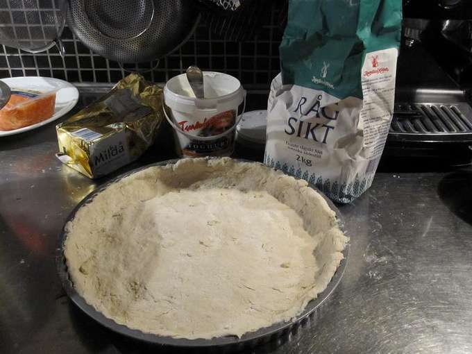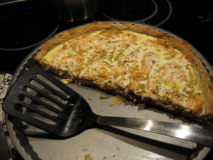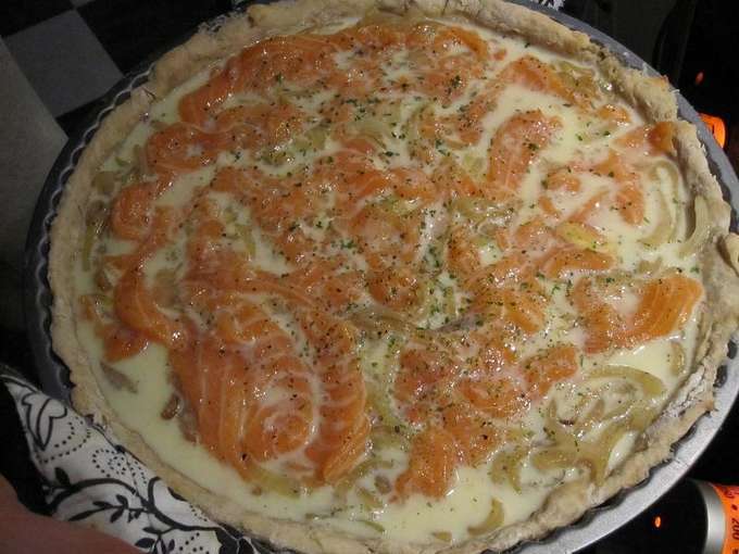 Sedan tog pojkvännen över, men det var i alla fall min idé. Så lite kredd till mig. Stek massor av gul lök med vitlök, så att den snudd på karamelliseras. Skär lax i små bitar och fixa en äggstanning. Förgrädda pajskalet och kör in alltihop i ugnen sen (som bilden visar).