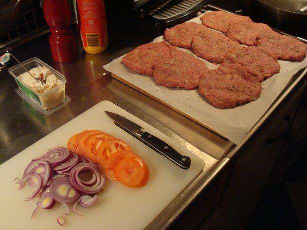 Så han knådade, jobbade och lät degen jäsa. Kom tillbaka, gjorde de små brödbullarna och lät de jäsa igen. Skalade och hackade löken. Arbetade ihop med köttfärsen och gjorde biffarna. (Inte lite heller, det ser ju ut att vara mat för ett helt kompani). Hade in brödet i ugnen och höll koll. Skar t.o.m. tomaterna och löken.