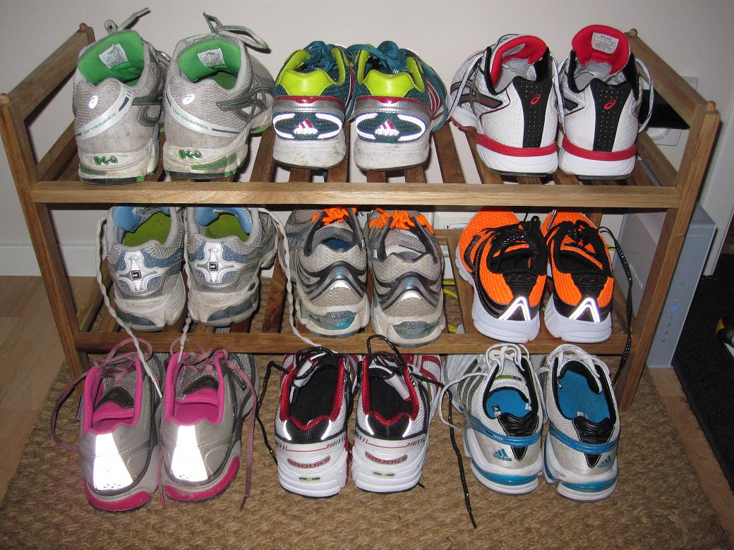 Jag har ju lovat att visa upp min otroligt snygga löparskosamling. Ett par är från 2009, resterande från 2010. 6 par är köpta, 3 par är sponsrade. 2 par är mängdskor, 1 par terrängskor, 1 par löpbandsskor, 3 par mellanlätta och 2 par riktigt lätta.
