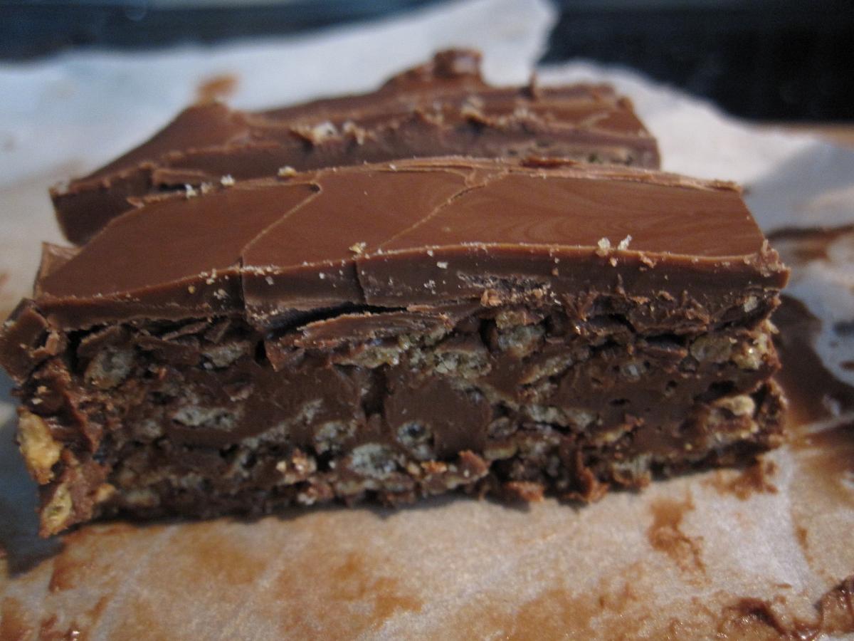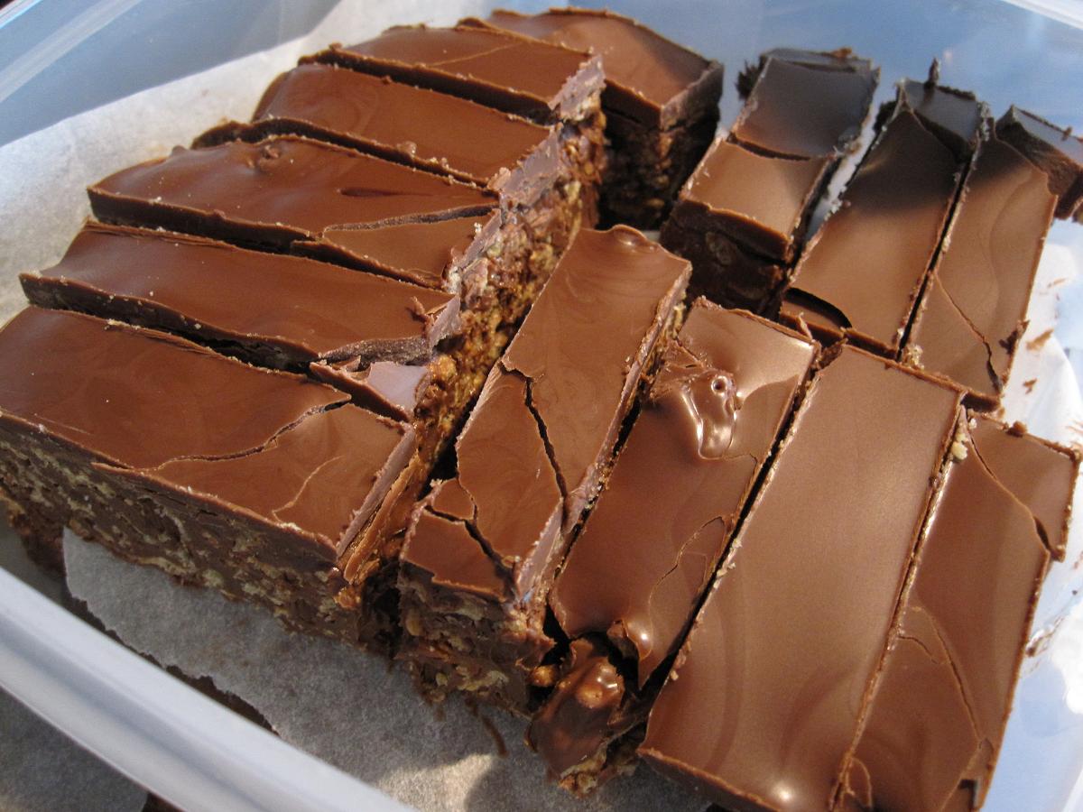Superenkla att fixa till. Man smälter ner ett block nougat, en burk nutella och lite blockchoklad i ett vattenbad. Sedan rör man ner en massa cornflakes och har ut på en form. Låt det svalna i kylskåpet, smält mer choklad och ha över som ett fint täcke. Låt svalna i kylskåpet igen.