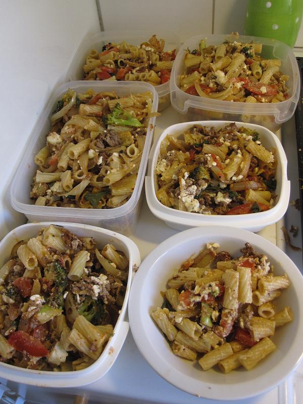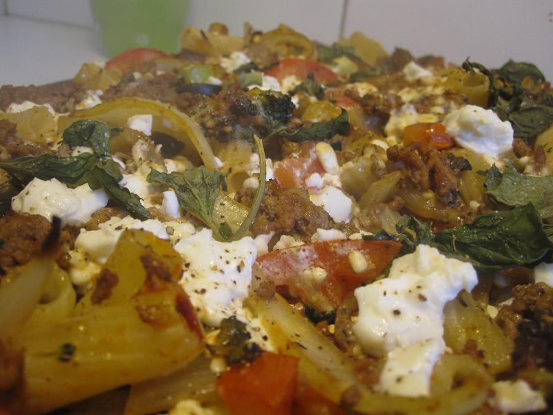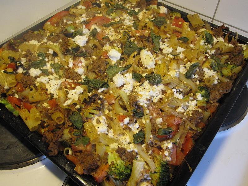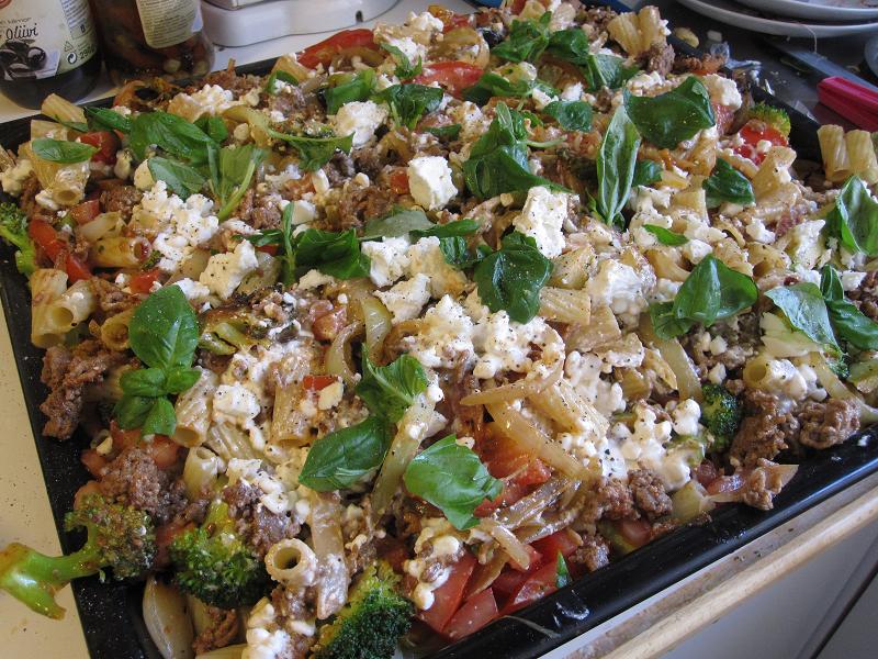 Jag stekte på en massa gul lök i en panna, 3 st stora (jag älskar lök) och ett stort broccolihuvud. Stekte även på köttfärs och hade i en klick grädde och tomarpuré. Kokade pasta halvklart. Satte igång ugnen. Skar tomater, soltorkade tomat och oliver. Gjorde en äggstanning med en massa ägg, keso och mjölk. BLANDADE ALLT i en stor plåt. Kluttade ut en massa fetasot, kryddor och basilikablad.