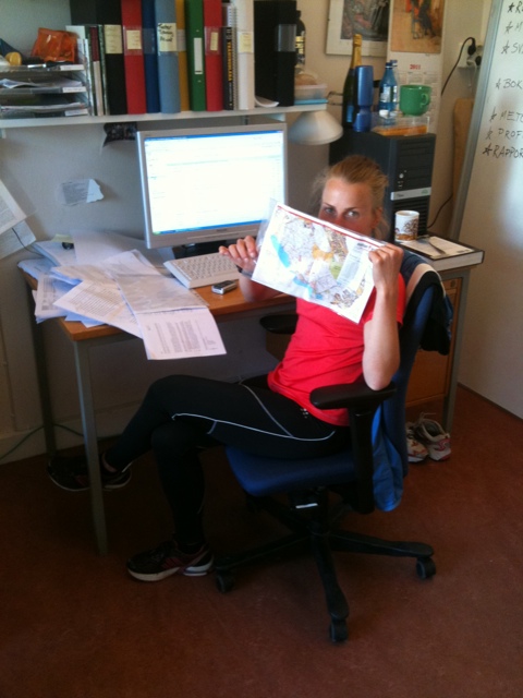 Frida satt på kontoret i löpartights. Somliga har det bra.. ;)