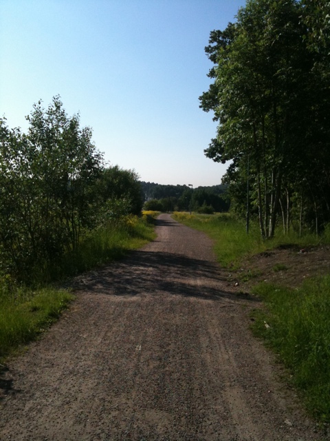 Pendeln var sen så jag missade bussen. Fick ta en 25minpromenad istället. Passerar några vackra stigar, och det är fan REN TORTYR att behöva stänga in sig på ett kontor nu…! Värme, sommar och med löparskor på fötterna. Jobbigt!!
