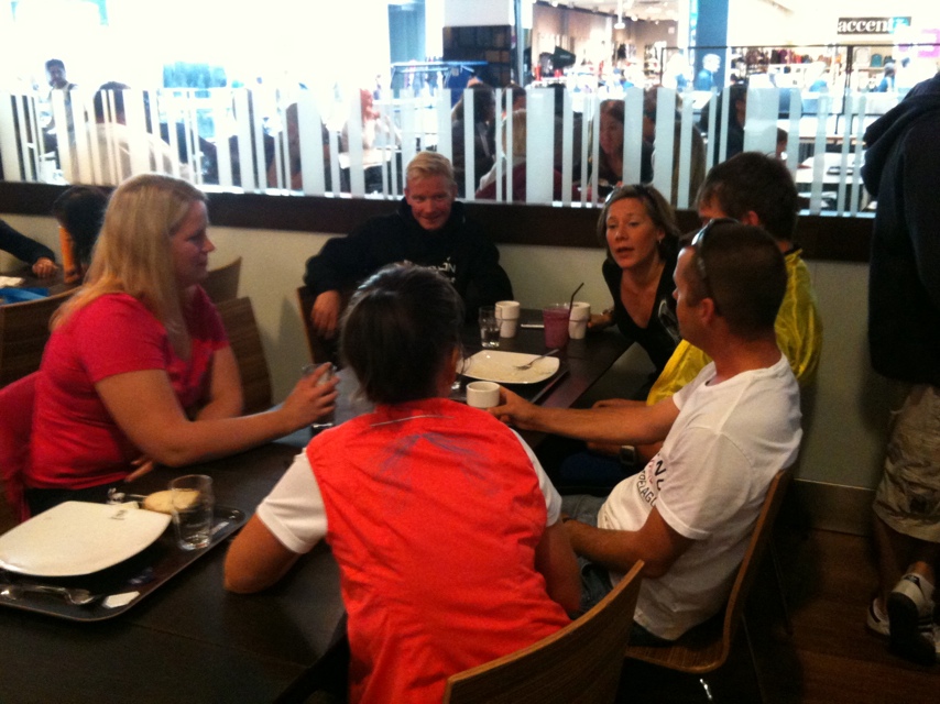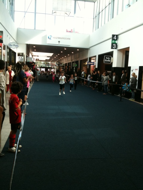 Efter att ha anmält Alex blev det en pasta i foodcourten och uppladdningskaffe efteråt med övriga folket. Och så hann vi heja på småttingarna som sprang också, haha så underhållande! Någon höll i ena skon och sprang, en annan i ett gosedjur…haha..