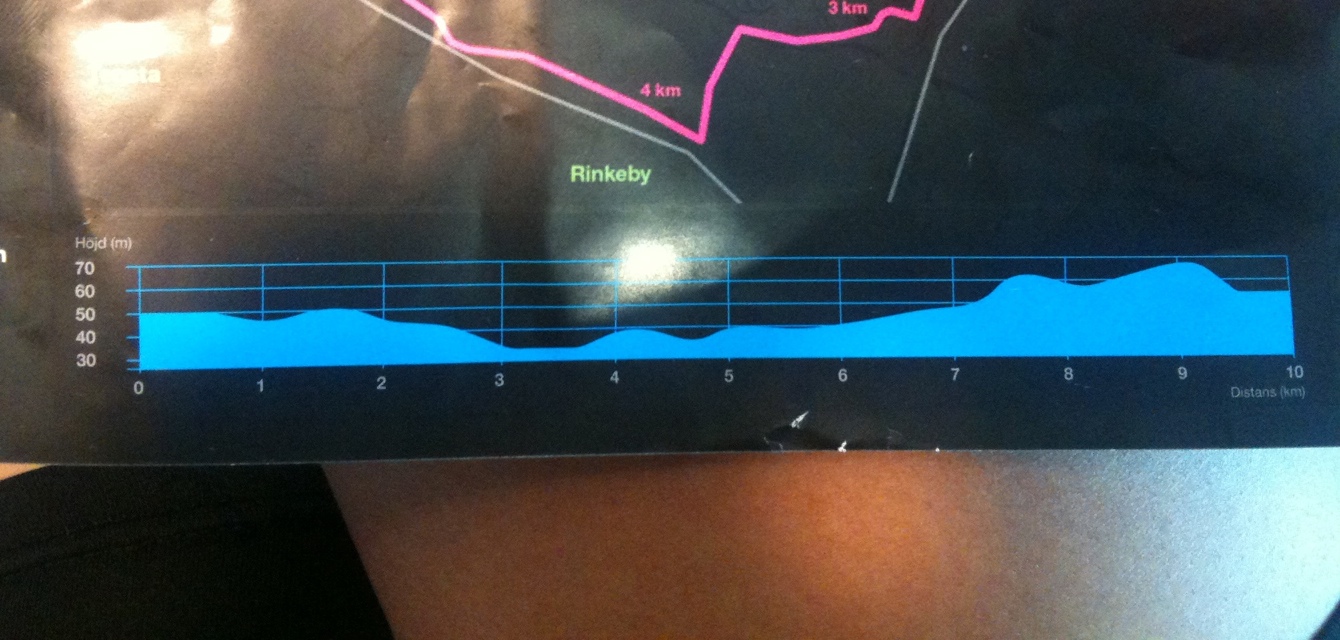 Här tror jag att jag faktiskt inte fattade att jag tappade så mycket tid. Att följande km gick på 4.22 och 4.26. Jag såg ju bara att den virtuella kompisen passerade, men jag hade ju marginal ner till 4.17fart resonerade jag. Så jag lät honom passera enkelt nästan. Om man ska analysera det hela tror jag att en kombination av att jag trodde det var lugnt/gruset/värmen gjorde kanske att jag inte fick till det där klippet i steget. Eller så tog jag ut mig i början, vad vet jag.